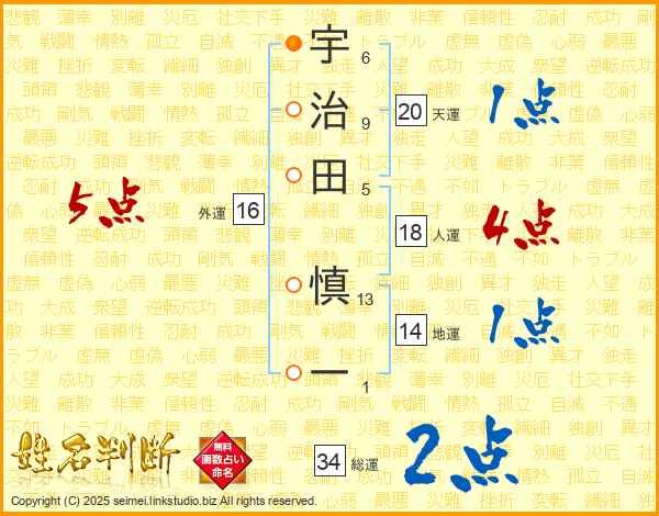 宇(6画)治(9画)田(5画) 慎(13画)一(1画)