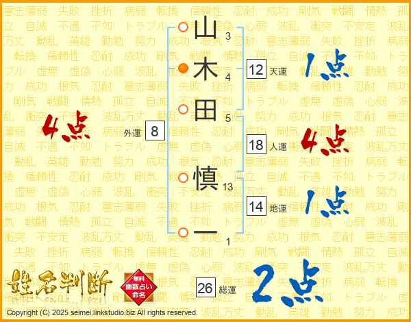 山(3画)木(4画)田(5画) 慎(13画)一(1画)