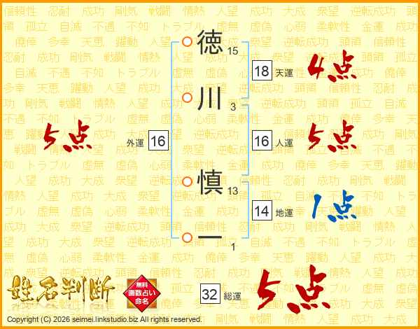 徳川慎一さんの総運は32画の5点!