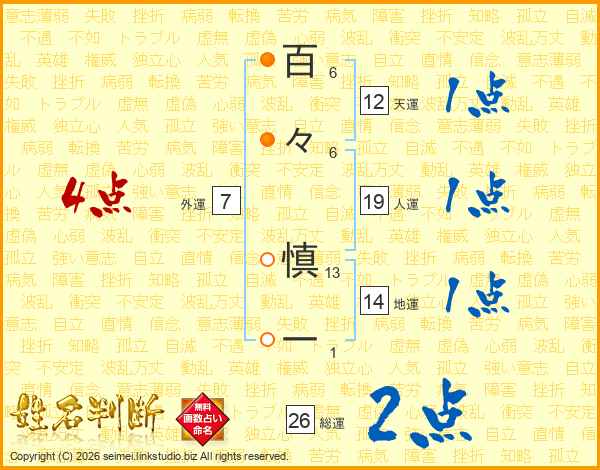 生活面を象徴する運勢です。外部から受ける影響力を表し、結婚運、家庭運や職場、環境への順応性を表します。総運から人運を引いた画数。姓や名が1文字の場合を除く。