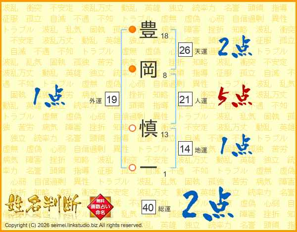 豊(18画)岡(8画) 慎(13画)一(1画)