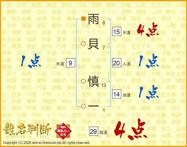 雨(8画)貝(7画) 慎(13画)一(1画)