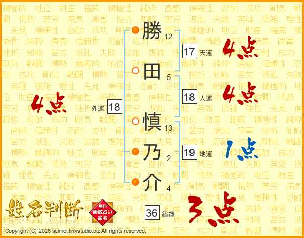 勝(12画)田(5画) 慎(13画)乃(2画)介(4画)