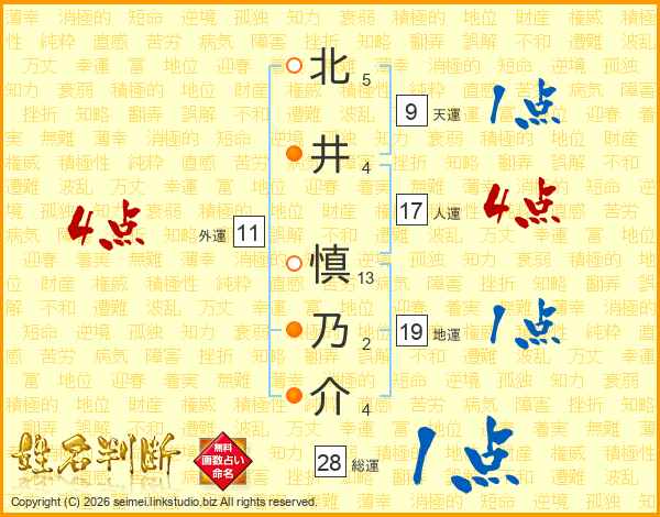北(5画)井(4画) 慎(13画)乃(2画)介(4画)