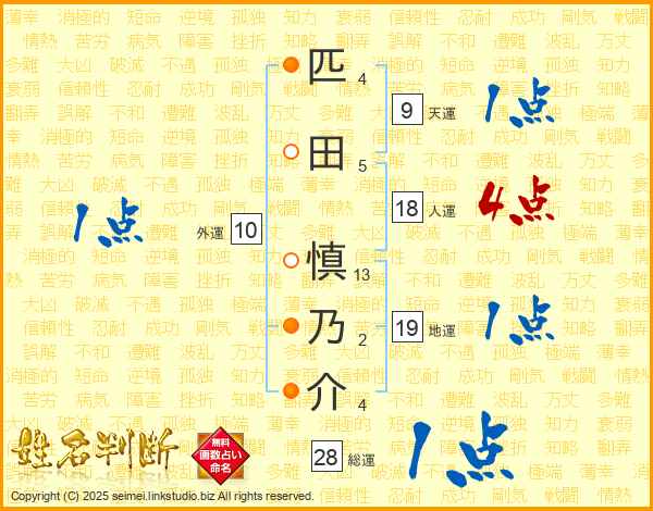 匹(4画)田(5画) 慎(13画)乃(2画)介(4画)