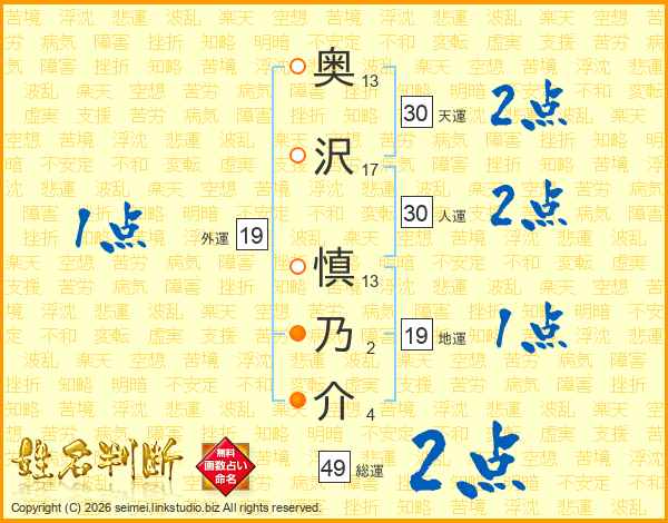 奥(13画)沢(17画) 慎(13画)乃(2画)介(4画)