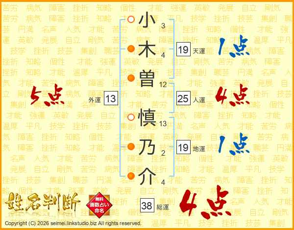 小(3画)木(4画)曽(12画) 慎(13画)乃(2画)介(4画)