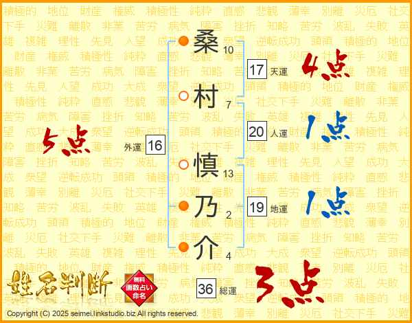 桑(10画)村(7画) 慎(13画)乃(2画)介(4画)
