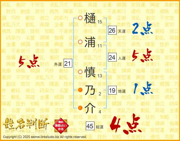 樋(15画)浦(11画) 慎(13画)乃(2画)介(4画)