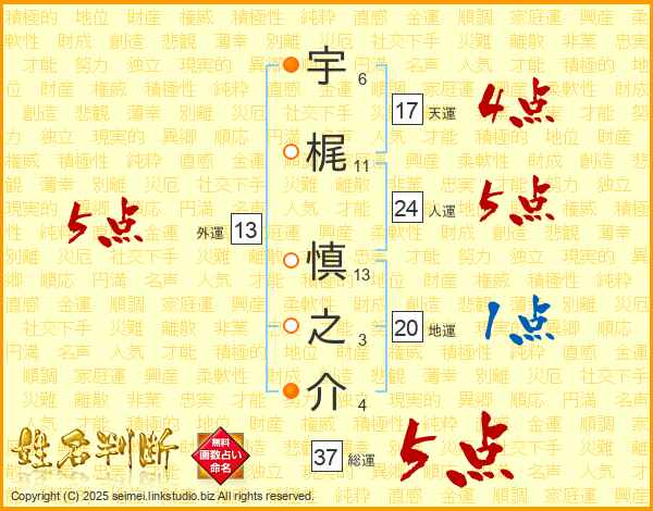 宇(6画)梶(11画) 慎(13画)之(3画)介(4画)