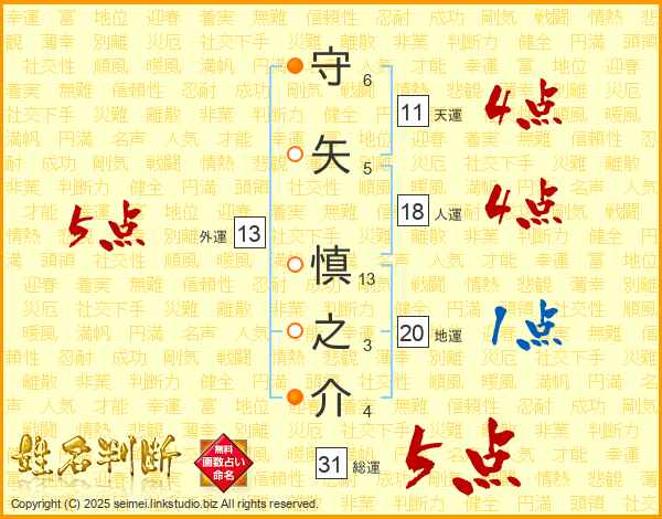 守(6画)矢(5画) 慎(13画)之(3画)介(4画)