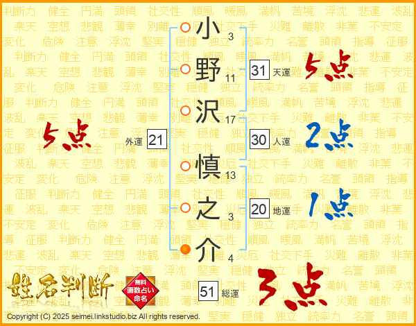 小(3画)野(11画)沢(17画) 慎(13画)之(3画)介(4画)