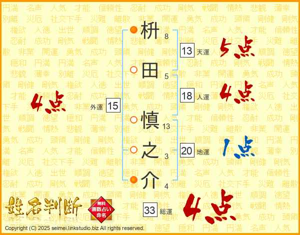 枡(8画)田(5画) 慎(13画)之(3画)介(4画)