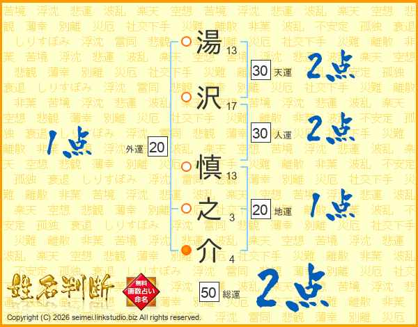 湯(13画)沢(17画) 慎(13画)之(3画)介(4画)