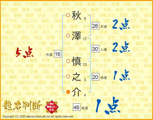 秋(9画)澤(17画) 慎(13画)之(3画)介(4画)