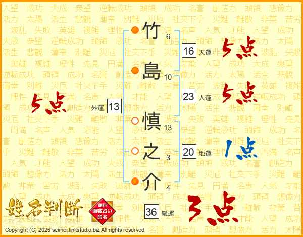 竹(6画)島(10画) 慎(13画)之(3画)介(4画)