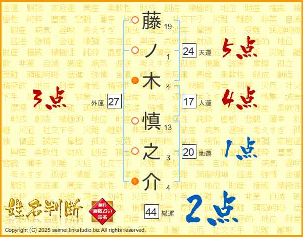 藤(19画)ノ(1画)木(4画) 慎(13画)之(3画)介(4画)