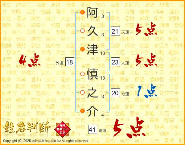 阿(8画)久(3画)津(10画) 慎(13画)之(3画)介(4画)