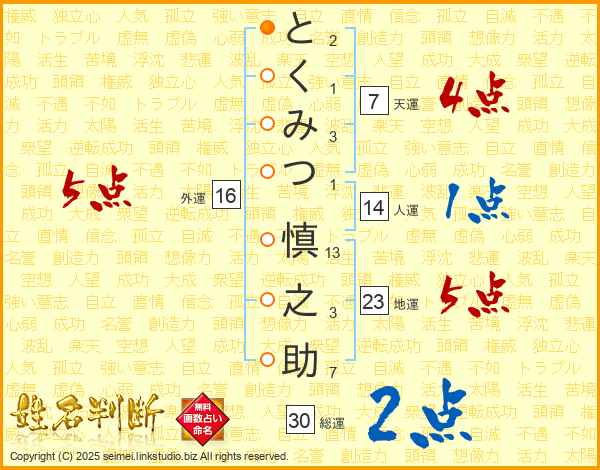と(2画)く(1画)み(3画)つ(1画) 慎(13画)之(3画)助(7画)