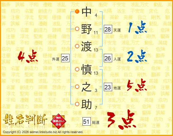中(4画)野(11画)渡(13画) 慎(13画)之(3画)助(7画)