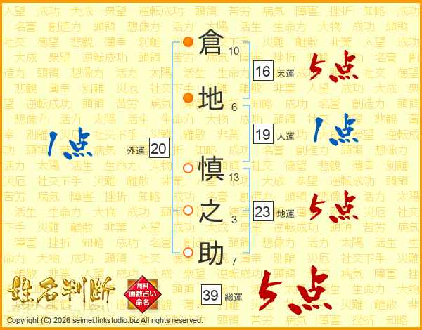 倉(10画)地(6画) 慎(13画)之(3画)助(7画)