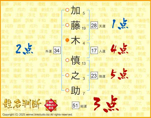加(5画)藤(19画)木(4画) 慎(13画)之(3画)助(7画)