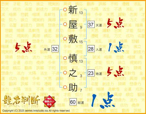 新(13画)屋(9画)敷(15画) 慎(13画)之(3画)助(7画)