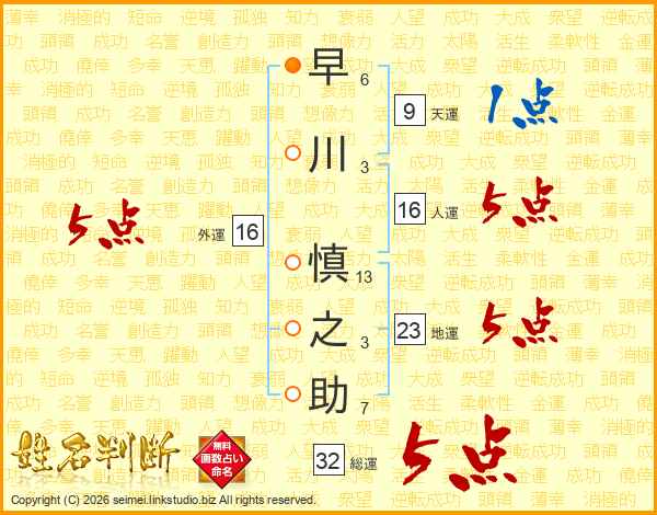 早(6画)川(3画) 慎(13画)之(3画)助(7画)