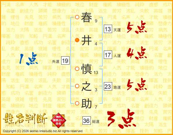 春(9画)井(4画) 慎(13画)之(3画)助(7画)