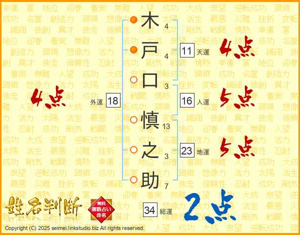 木(4画)戸(4画)口(3画) 慎(13画)之(3画)助(7画)