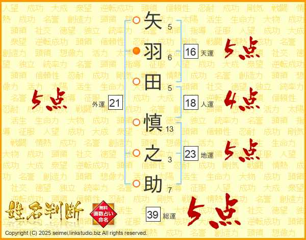矢(5画)羽(6画)田(5画) 慎(13画)之(3画)助(7画)