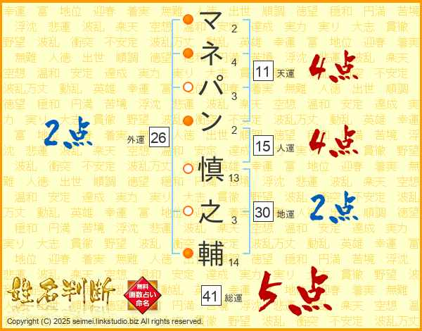 マ(2画)ネ(4画)パ(3画)ン(2画) 慎(13画)之(3画)輔(14画)