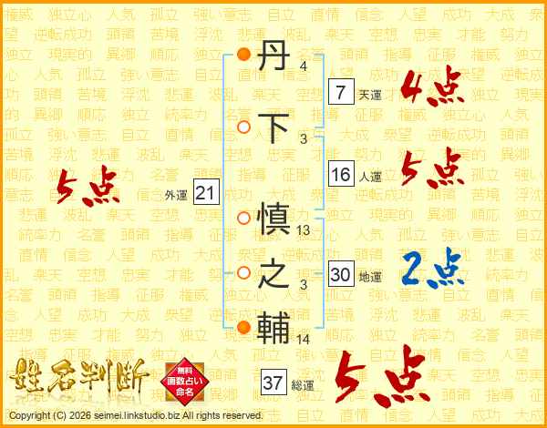 丹下慎之輔さんの総運は37画の5点!
