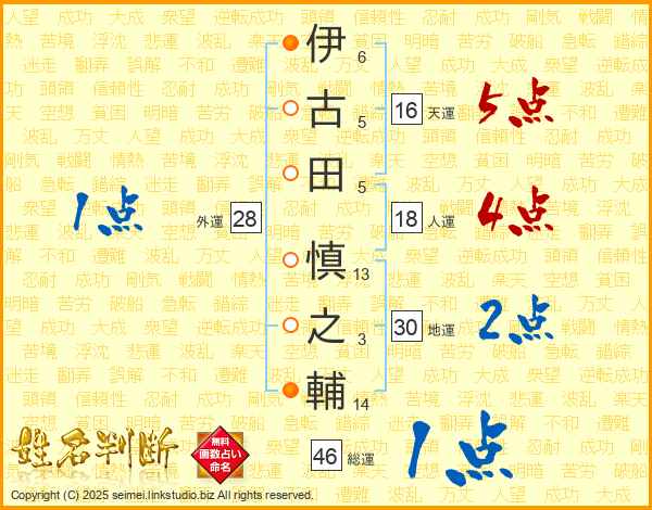 伊(6画)古(5画)田(5画) 慎(13画)之(3画)輔(14画)