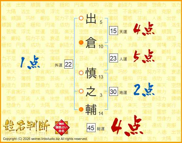 出(5画)倉(10画) 慎(13画)之(3画)輔(14画)