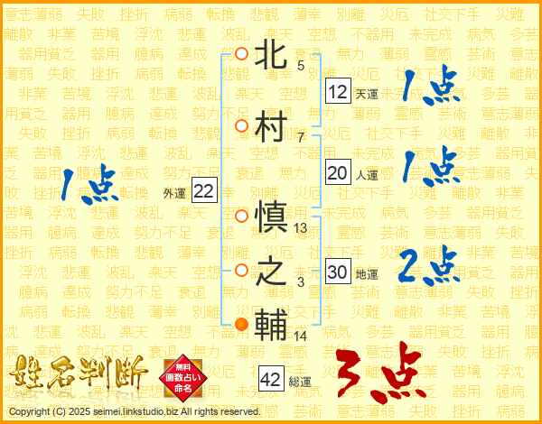 北(5画)村(7画) 慎(13画)之(3画)輔(14画)