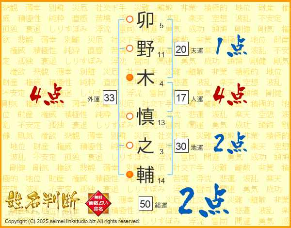 卯(5画)野(11画)木(4画) 慎(13画)之(3画)輔(14画)
