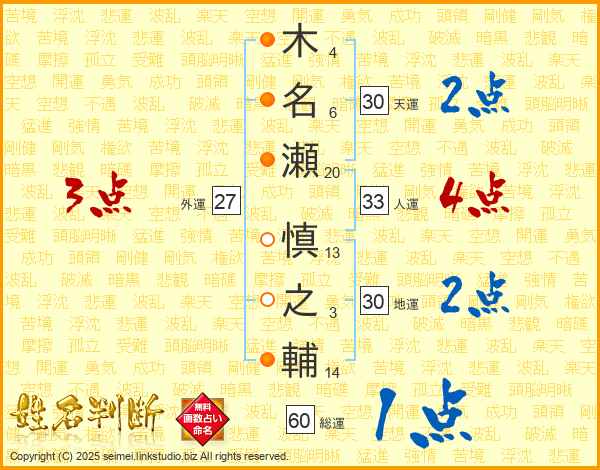 木(4画)名(6画)瀬(20画) 慎(13画)之(3画)輔(14画)