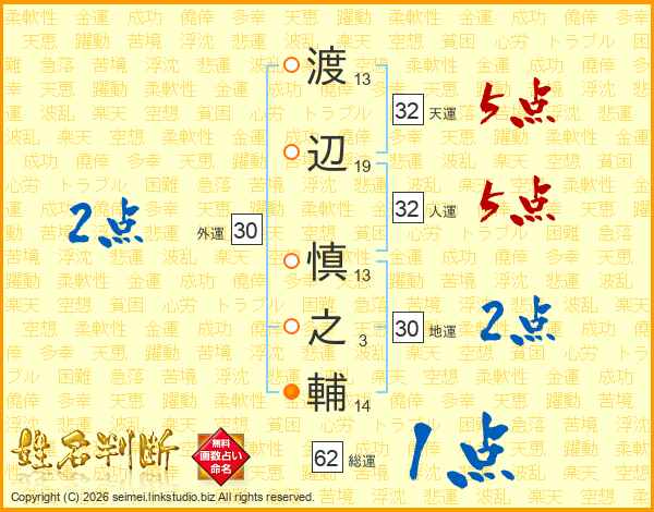 渡(13画)辺(19画) 慎(13画)之(3画)輔(14画)