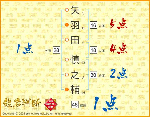矢(5画)羽(6画)田(5画) 慎(13画)之(3画)輔(14画)