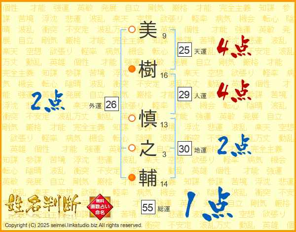 美(9画)樹(16画) 慎(13画)之(3画)輔(14画)