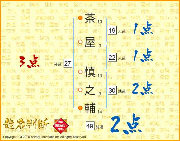 茶(10画)屋(9画) 慎(13画)之(3画)輔(14画)
