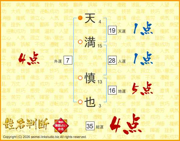 天(4画)満(15画) 慎(13画)也(3画)