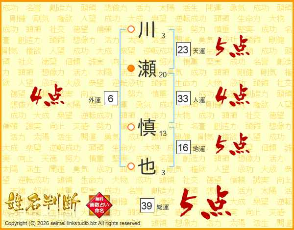 川(3画)瀬(20画) 慎(13画)也(3画)