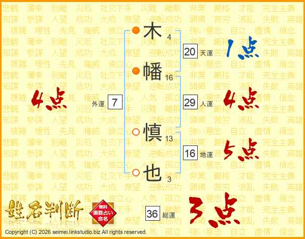 木(4画)幡(16画) 慎(13画)也(3画)