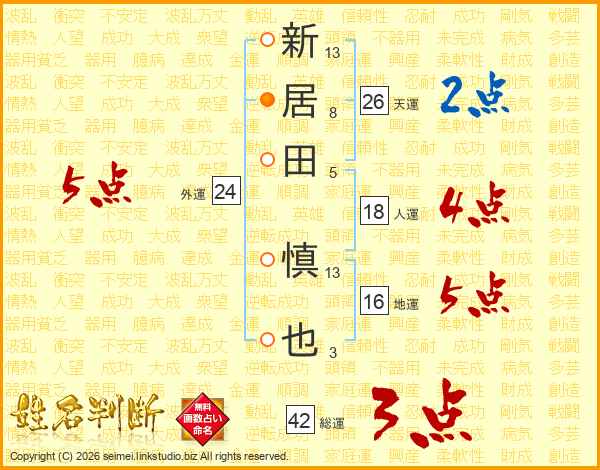 新(13画)居(8画)田(5画) 慎(13画)也(3画)