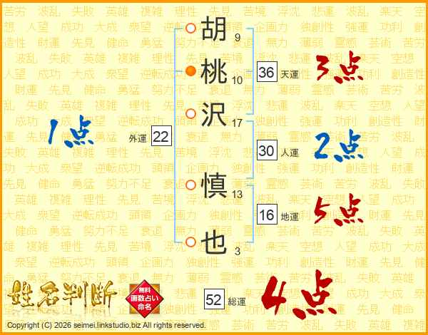 胡(9画)桃(10画)沢(17画) 慎(13画)也(3画)
