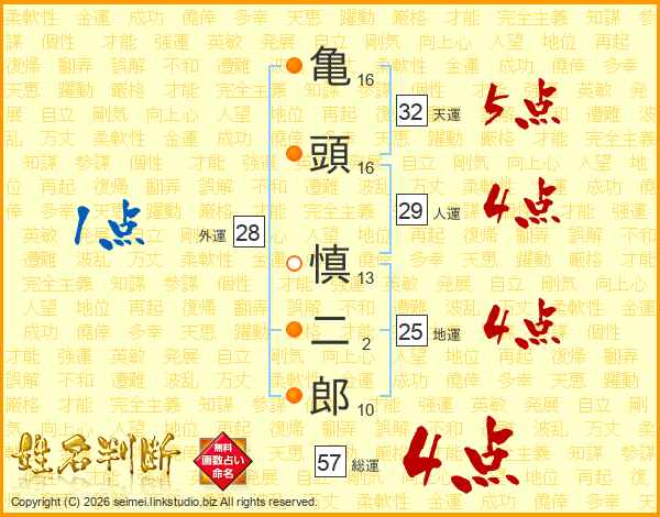 亀頭慎二郎さんの総運は57画の4点!