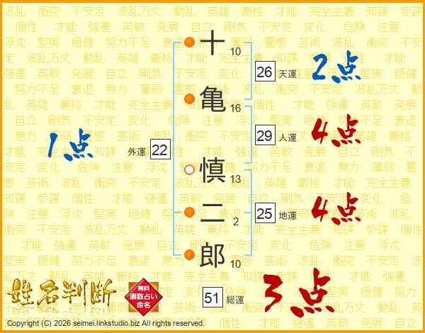 十(10画)亀(16画) 慎(13画)二(2画)郎(10画)