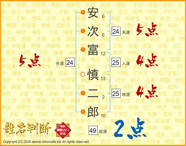 安(6画)次(6画)富(12画) 慎(13画)二(2画)郎(10画)